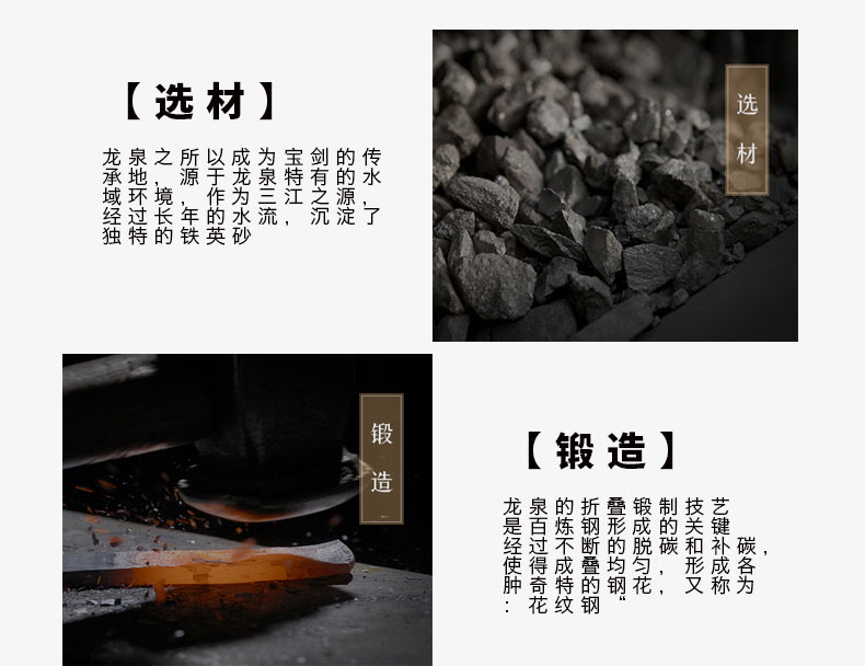 龙泉宝剑是中华古兵器的代表,国家非物质文化遗产。 迄今已有2500余年,拥有浓厚的历史渊源和文化底蕴。龙泉市 源于春秋时期铸剑师欧冶子为楚王所铸“龙渊剑”而得名,避 讳唐高祖李渊,改名“龙泉”。自古龙泉因剑驰名,有“龙泉颜 色为霜雪,良工咨嗟叹奇绝”之咏。一把完整的龙泉剑工艺需要经过28道手工工序完成。
