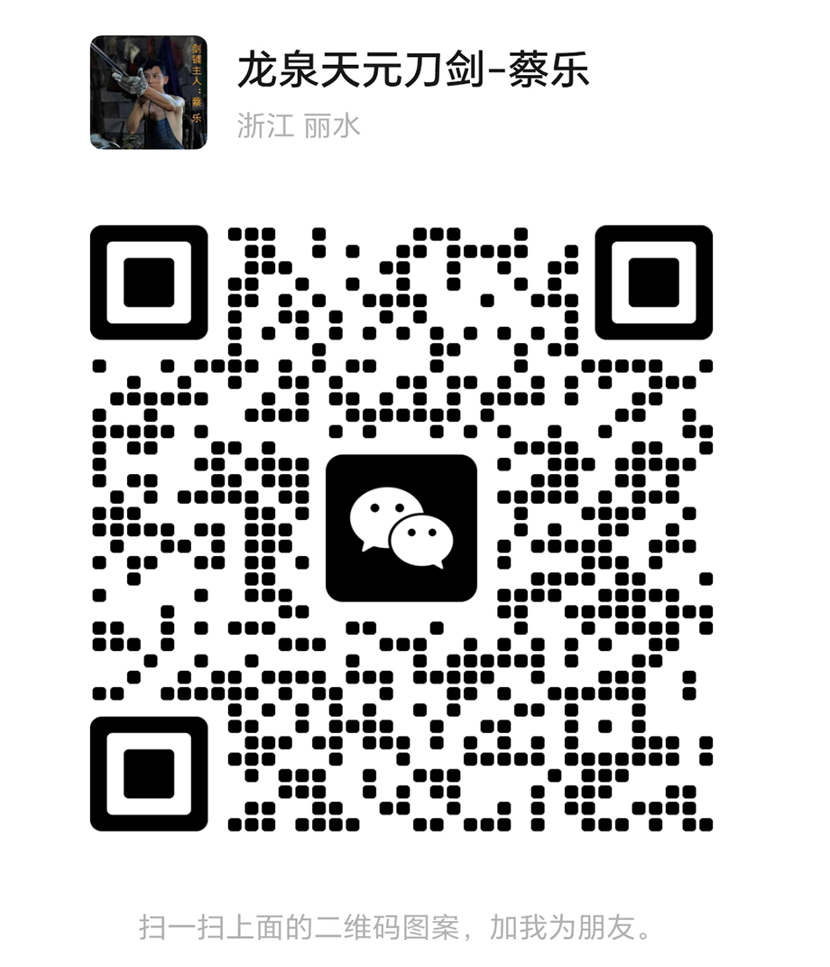 蔡 乐(书生匠心)。1983年土生土长于浙江龙泉,现为龙泉市宝剑协会会员,丽水市作家协会会员,作品先后多次获国家级地方金银铜奖,并拥有多项国家实用及外观专利。 2005年从业销售宝剑,将文化、宝剑、电商融汇贯通。成功树立“天元”“紫清”“正则”等品牌,致力研发刀剑艺术性,专注刀剑文化拓新。继承古法锻造技艺,光复新冷兵器文化,秉承龙泉宝剑传统手工价值。2018年专注批发代发分销,为有营销能力的客户创造更好的产品优势。提供为各刀剑商套牌服务,接受定制,价格才是硬道理,品质才是真诚信。期待与合作。龙泉天元刀剑